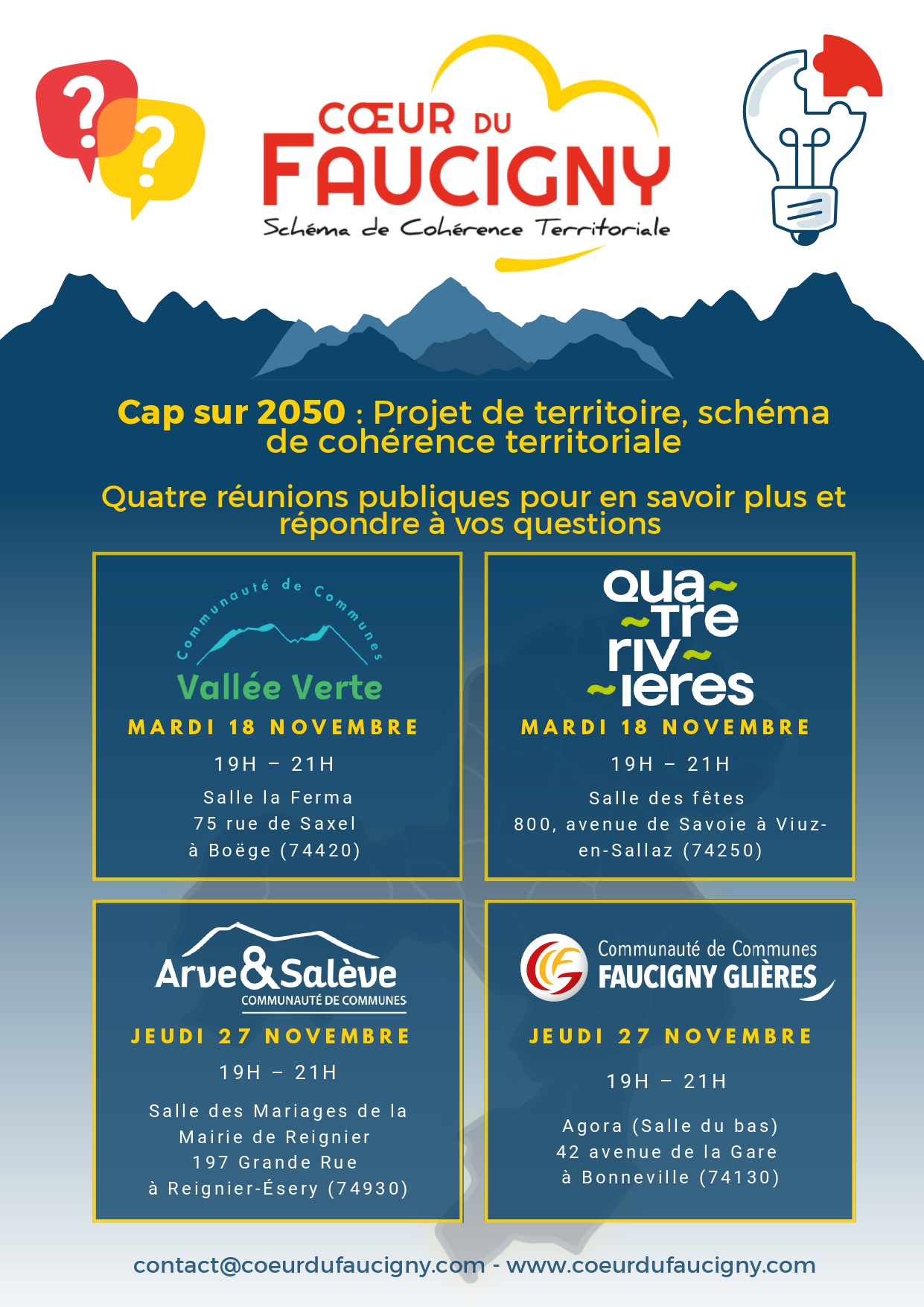 Le Syndicat Mixte SCoT Cœur du Faucigny a le plaisir de vous inviter à participer aux réunions publiques qui se tiendront durant le mois de novembre sur notre territoire.